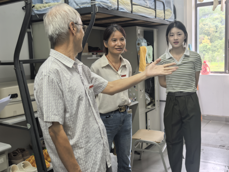 “同学你好,我们是学院的老师!”每推开一扇门,都有学长学姐热情介绍。丁院长和张书记秒变“大家长”,一句“从哪里来?”“住得习惯吗?”瞬间拉近距离。丁院长还特别叮嘱:用电安全要牢记,守规矩才是真的酷!张书记也送上开学通关秘籍:“调整好状态,做好时间管理,大学这场升级打怪的游戏,你一定能赢!”