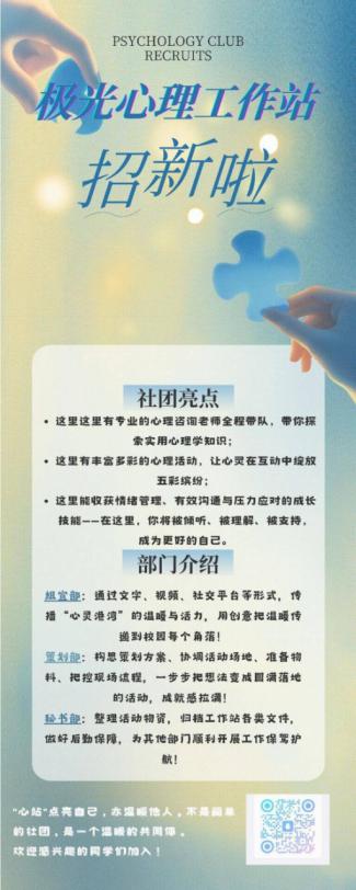 在这里,你不仅能近距离接触心理学知识,有专业的老师带队团队心理辅导培训,还能在实践中提升文案创作、活动策划、统筹管理等多种能力;更能认识一群志同道合、温暖有趣的伙伴,一起在心理学的世界里探索成长,收获珍贵的友谊与难忘的经历。【加入我们任期满一年并考核合格后还可获得16个心理实践课时,以及评优评先的机会】