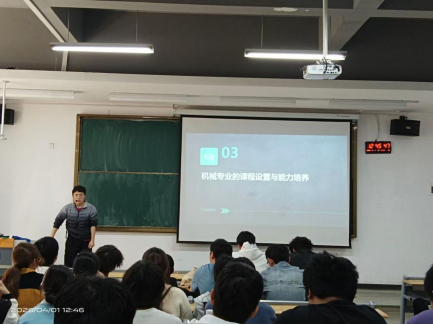 王全刚老师首先以“机械专业就业前景与专业介绍”为核心议题,为同学们拉开了探索机械世界的序幕。他以清晰脉络勾勒机械专业的发展征程,重点解读新能源、智能制造等前沿赛道对机械人才的迫切渴求,深度剖析风力发电、太阳能发电、新能源汽车等核心领域的行业演进逻辑与人才素养要求。同时,王老师围绕专业课程体系与核心能力培养,引导同学们明确学习靶向、筑牢专业根基,让同学们直观体悟机械专业在国家战略产业中的核心使命,清晰感知专业学习与未来职业的紧密羁绊。