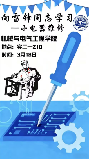 三月春风润心田,雷锋精神永相传。为弘扬奉献、友爱、互助、进步的志愿精神,机械与电气工程学院团总支、学生会于雷锋月期间开展 “匠心修旧物 温情暖校园” 义务维修小电器的主题活动,以专业技能践行初心使命,用志愿服务传递温暖力量,让雷锋精神在新时代绽放光彩。